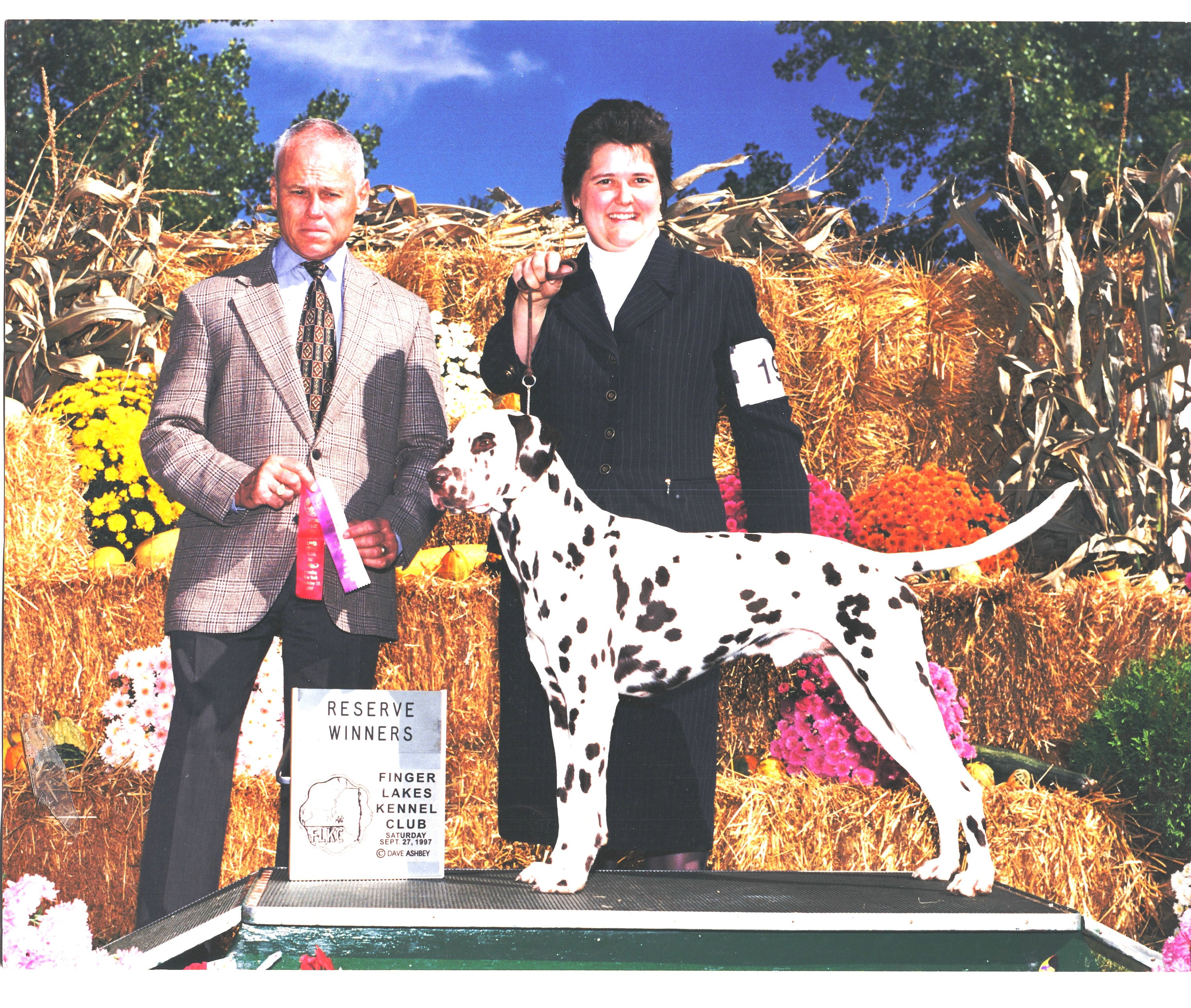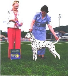 Am. Ch./Can. Ch. Robynpond Scout Red Hawk, CD - Scout was a terrific liver brown spotted dalmatian. He was the first competitive showdog that Jennifer exhibited. He earned his American and Canadian Championships with her handling. He earned his Companion Dog (CD) title in AKC Obedience competition. He taught us how to show and how to train. He played the guitar by strumming the strings with his paw. He played from the age of 7 months until he passed away at 11 yrs. old. Scout loved the show ring and loved to retrieve. He thrived on attention and sired 2 champions. He had a heart of gold.