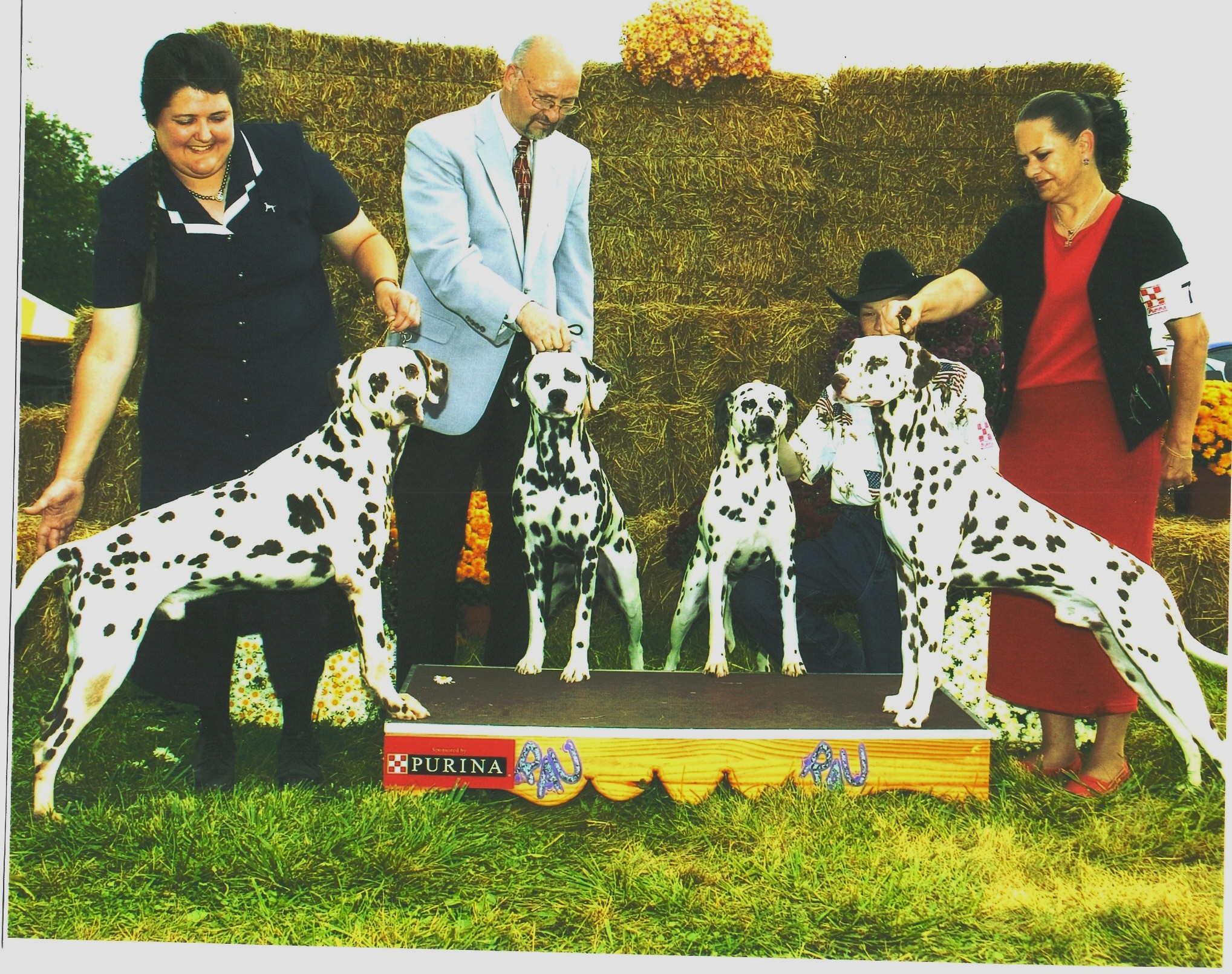 Am. Ch./Can. Ch. McDottie Robynpond's Gabriel - Gabriel is the son of Confetti and Rocky. He is owned by Dana Battistoni and shown by Linda Boney. He has produced pups that are champions. Gabriel is on the right with Linda. Jennifer is on the left with Scout. In the back is the late Bob Race that I got Scout from. In the back is my son, Kevin with Confetticini, the mother of Gabriel.